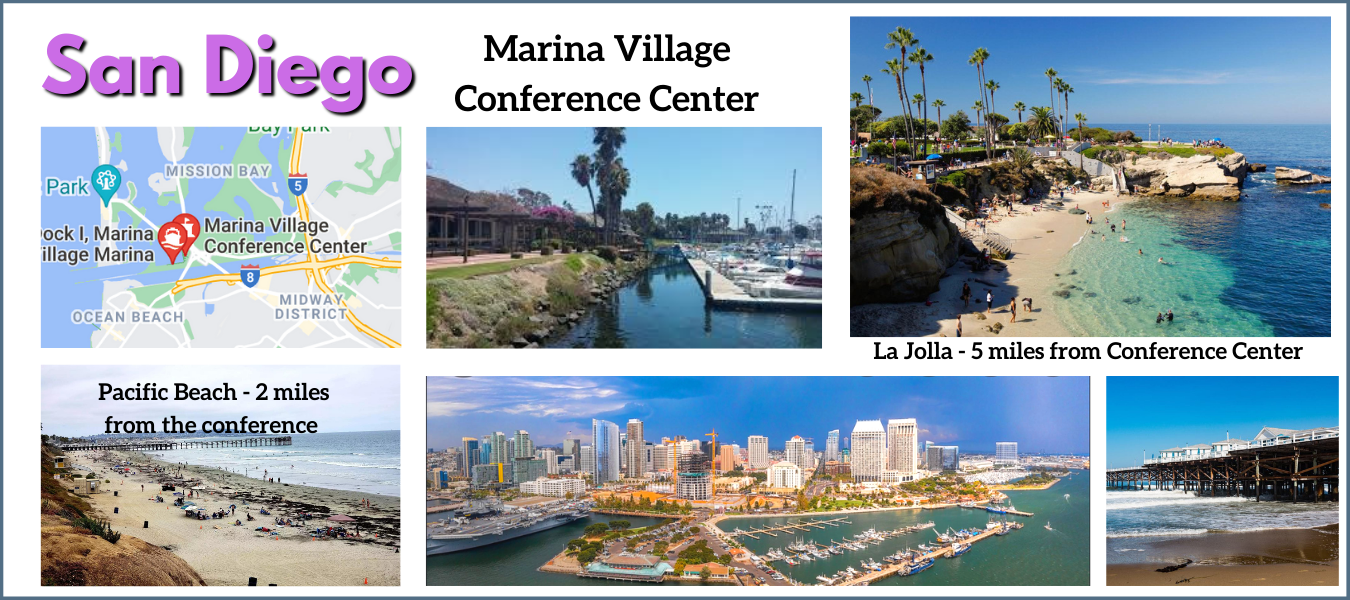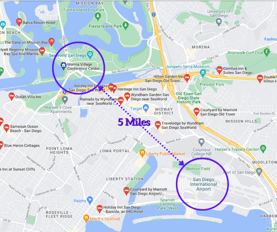 San Diego is a very convenient city to fly into - and the Marina Village is close to the airport, about 5 miles. There are dozens of hotels nearby, 10-15 minutes or less from the class location. Ubers and taxi options. No need to rent a car, etc.